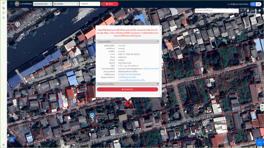 เมื่อเราได้กรอกข้อมูลไปแล้ว ในภาพ คือ ภาพดาวเทียมของเว็บกรมที่ดิน ตามภาพก็จะแสดงตำแหน่งพิกัดของที่ดินอย่างแม่นยำครับ จะมีรายละเอียดของขนาดที่ดิน ระบุขนาดที่ถูกต้องและชัดเจนที่สุด วิธีนี้ก็เป็นอีกวิธีที่ผู้รับเหมาถมที่ดินอย่างพวกเราก็ใช้ในการดูขนาดที่ดินจริงก่อนถมที่ดินครับ จะได้ไม่เกิดปัญหาในการถมที่ดินเกินขอบเขตครับ