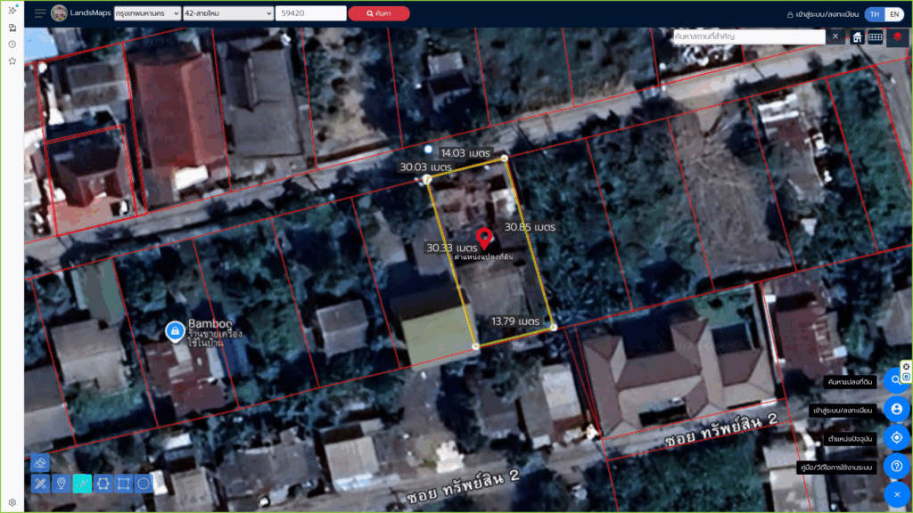 ในการเช็คขนาด ขอบเขตเนื้อที่ของที่ดิน ความกว้างของที่ดินก็ทำได้ง่ายครับ เพราะจะมีแถบเครื่องมือให้เราเลือกใช้ในการวัดเขตที่ดินอยู่ด้านล่างซ้ายมือของหน้าจอครับ ตัวอย่างในภาพเราได้ลองวัดขอบเขตโดยการใช้เว็บไซต์ของกรมที่ดินในการตรวจสอบเพื่อยืนยันขอบเขตก่อนที่จะเข้าวัดที่ดินจริง เพื่อนำกล้องวัดระดับที่ดินเข้าวัดเพื่อหาค่าเฉลี่ยของที่ดินจริงครับ